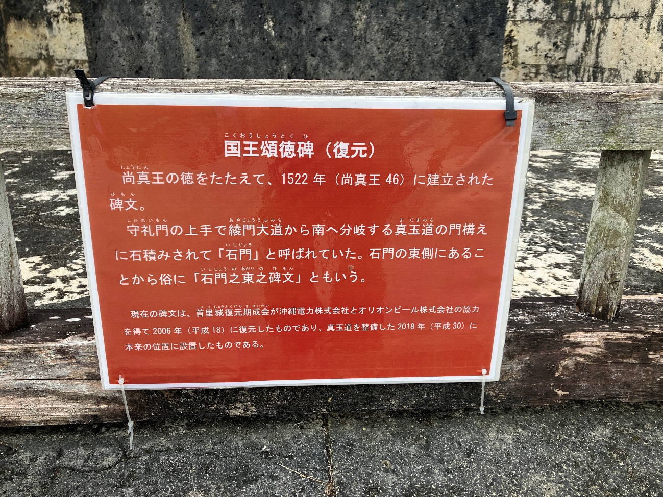 現在の碑文は、 首里城復元期成会が沖縄電力株式会社とオリオンビール株式会社の協力を得て2006年(平成18)に復元したものであり、 真玉道を整備した2018年 (平成30)に本来の位置に設置したものである。