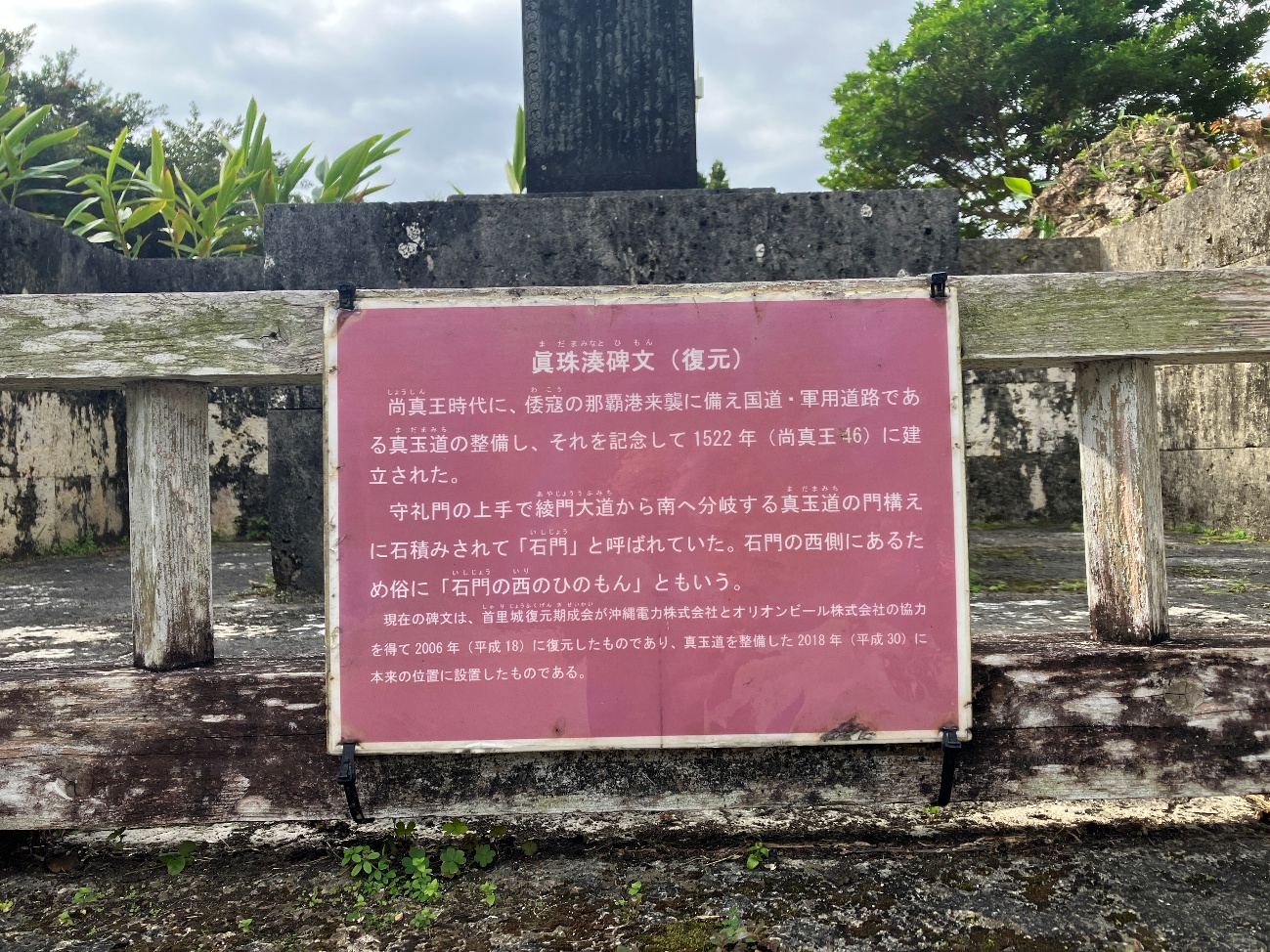 現在の碑文は、首里城復元期成会が沖縄電力株式会社とオリオンビール株式会社の協力を得て2006年(平成18)に復元したものであり、 真玉道を整備した2018年 (平成30)本来の位置に設置したものである。