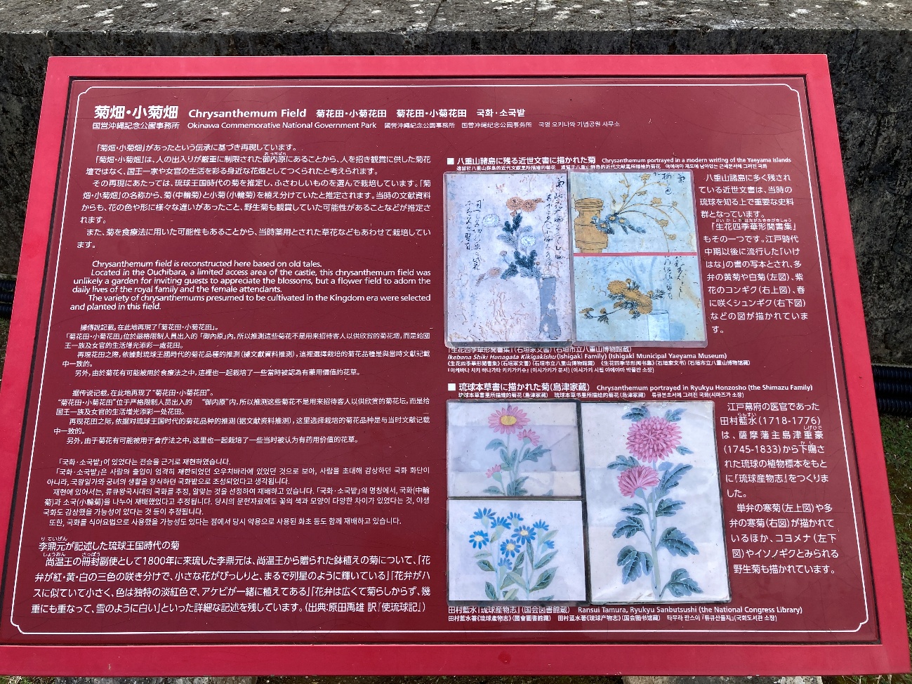 「菊畑・小菊畑」は、人の出入りが厳重に制限された御内原(おうちばら)にあることから、人を招き観賞に供した菊花壇ではなく、国王一家や女官の生活を彩る身近な花畑としてつくられたと考えられます。