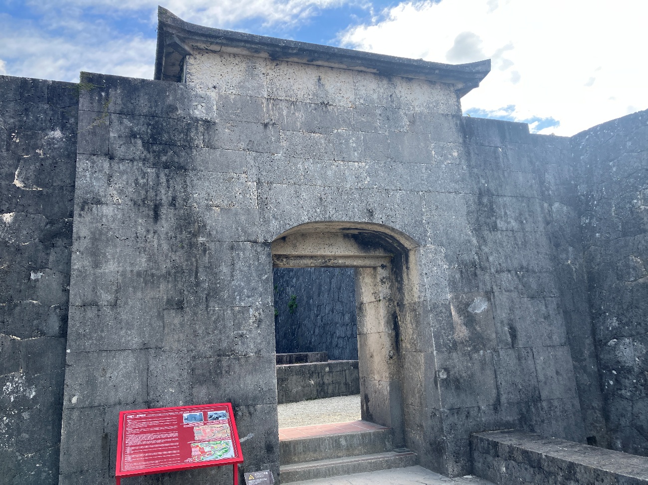 石門は竹富島の西糖(にしとう)の作と伝えられる石材は主に琉球石灰岩を用い板唐破風屋根(いたぶきからはふうやね)を表わす 屋根の飾りなどに日本と中国の様式を合わせて用いた沖縄独特の優れた石造建築である