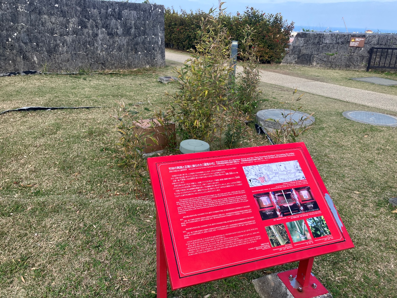古地図や伝承に基づき、この場所に竹林を再現しています。どのような種類の竹があったかは不明ですが、正殿の床の間に飾られていた竹は、 ここから採られていたことが想定されます。