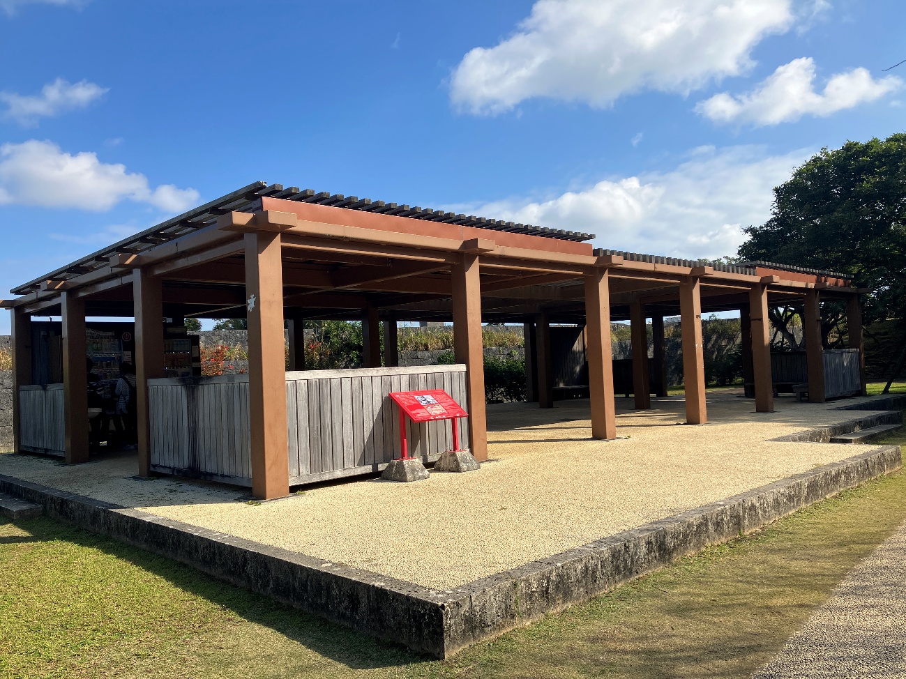 復元整備によって、建物の輪郭と柱位置を平面表示した上に、かつての銭蔵をイメージした休憩施設を設置しています。