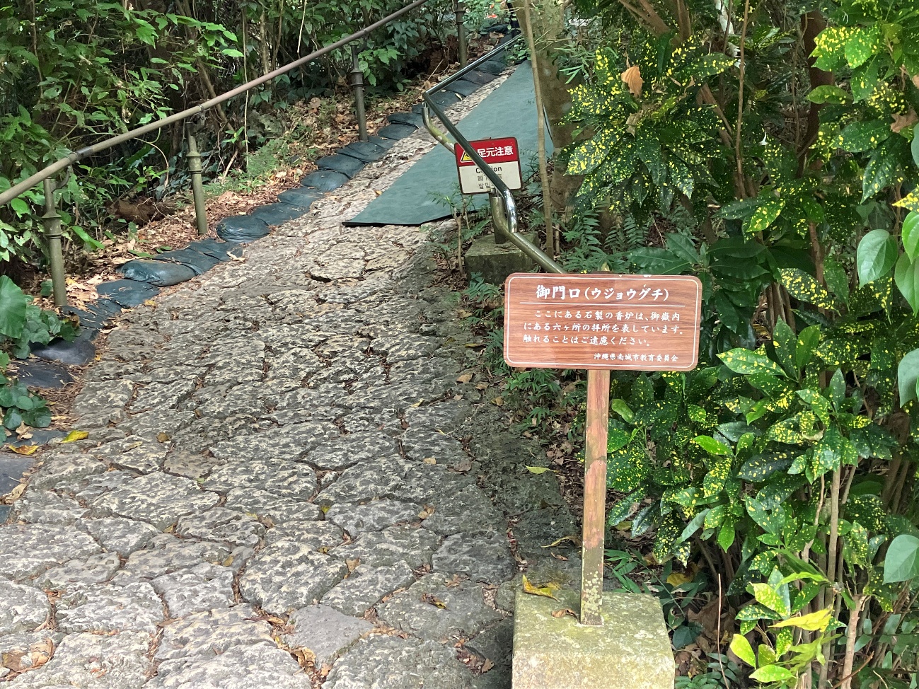 御門口(ウジョウグチ)へと至る参道は坂道となっており、坂道を歩きやすくするために急斜面の部分には琉球石灰岩を用いた階段を造っていました。