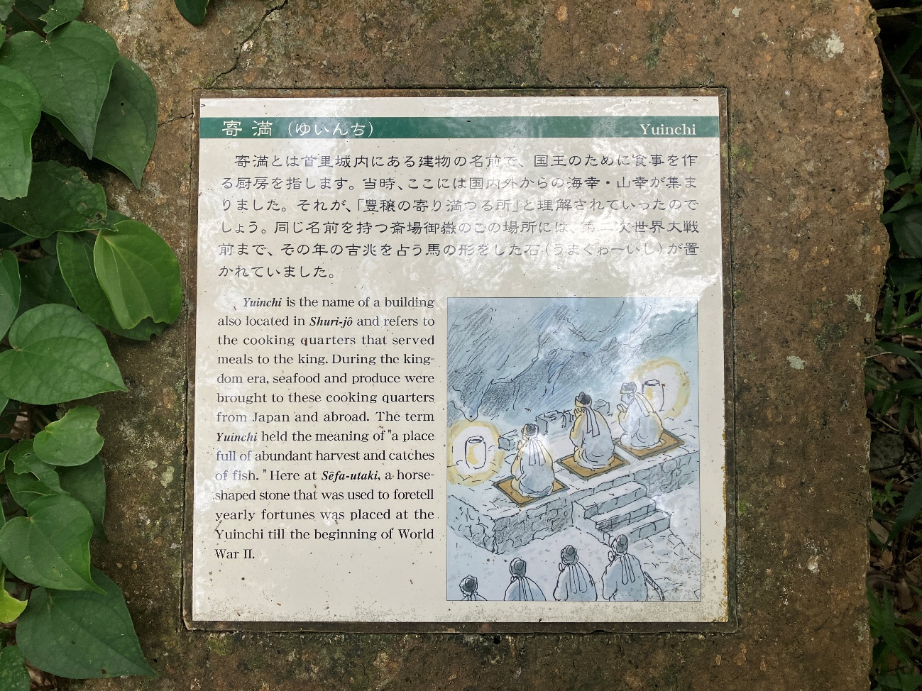 同じ名前を持つ斎場御嶽のこの場所には、第二次世界大戦前まで、その年の吉兆を占う馬の形をした石(うまぐわーいし)が置かれていました。