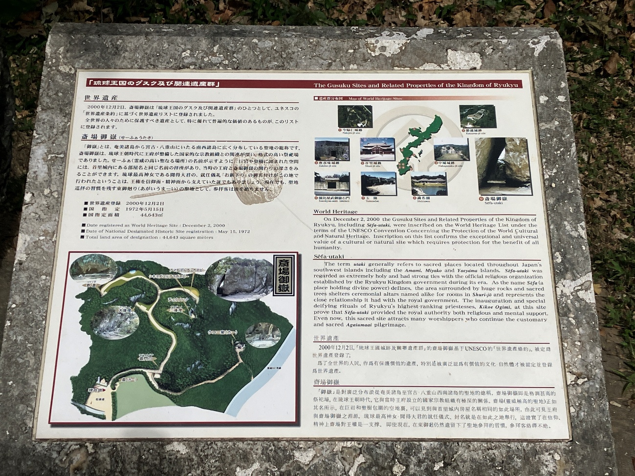 2000年12月2日、斎場御は「琉球王国のグスク及び関連遺産群」のひとつとして、ユネスコの「世界遺産条約」に基づく世界遺産リストに登録されました。