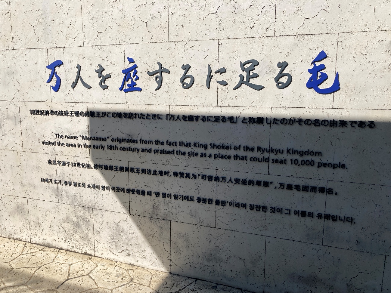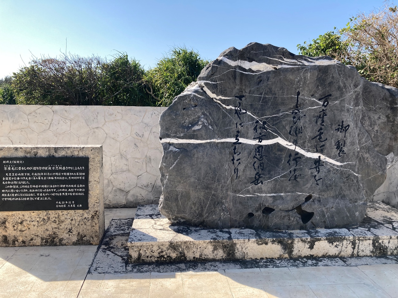 歌意は、 「波も風も穏やかになってほしい。 はるばる国王が万座毛に立ち寄られるのだから、 その顔を拝みたいものだ」。