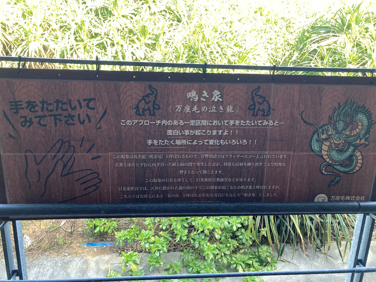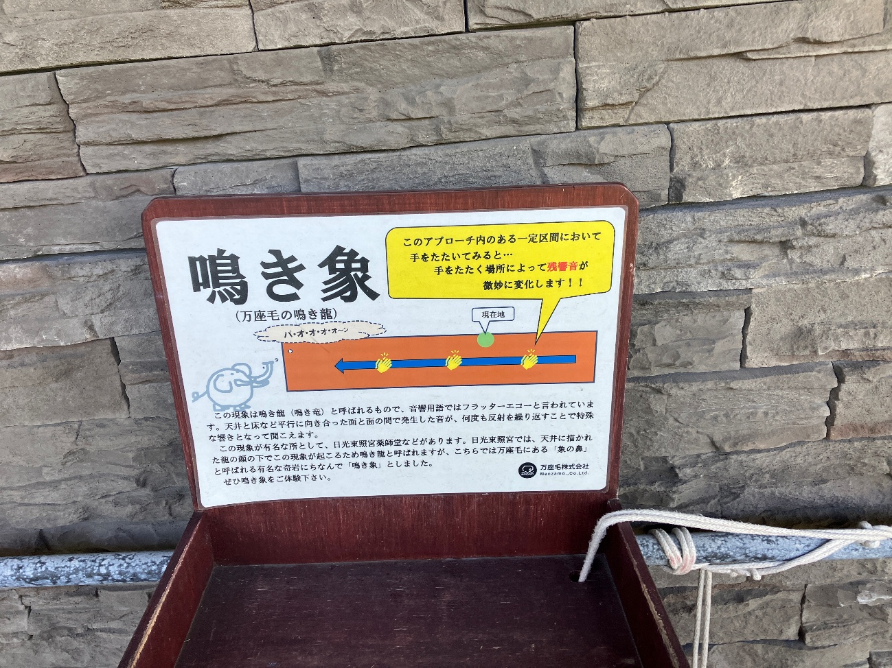 日光東照宮では、天井に描かれた龍の顔の下でこの現象が起こるため鳴き龍と呼ばれますが、こちらでは万座毛にある「象の鼻」と呼ばれる有名な奇岩にちなんで「鳴き象」としました。