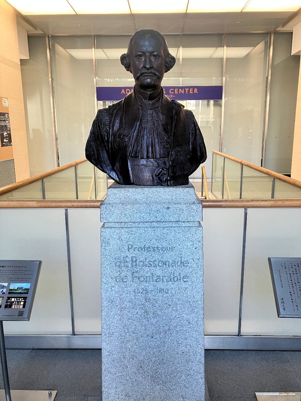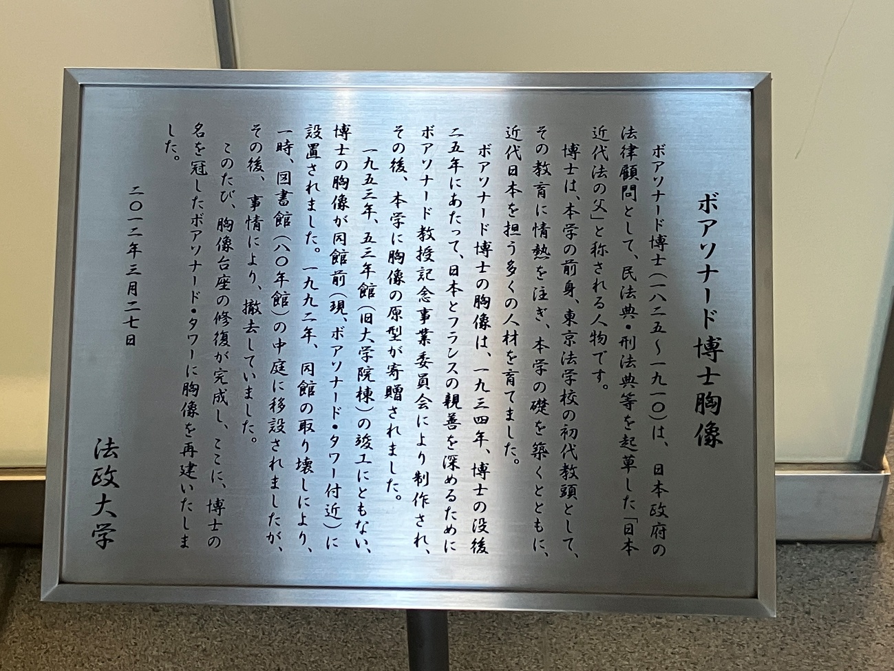 このたび、胸像台座の修復が完成し、ここに、博士の名を冠したボアソナード・タワーに胸像を再建いたしました。