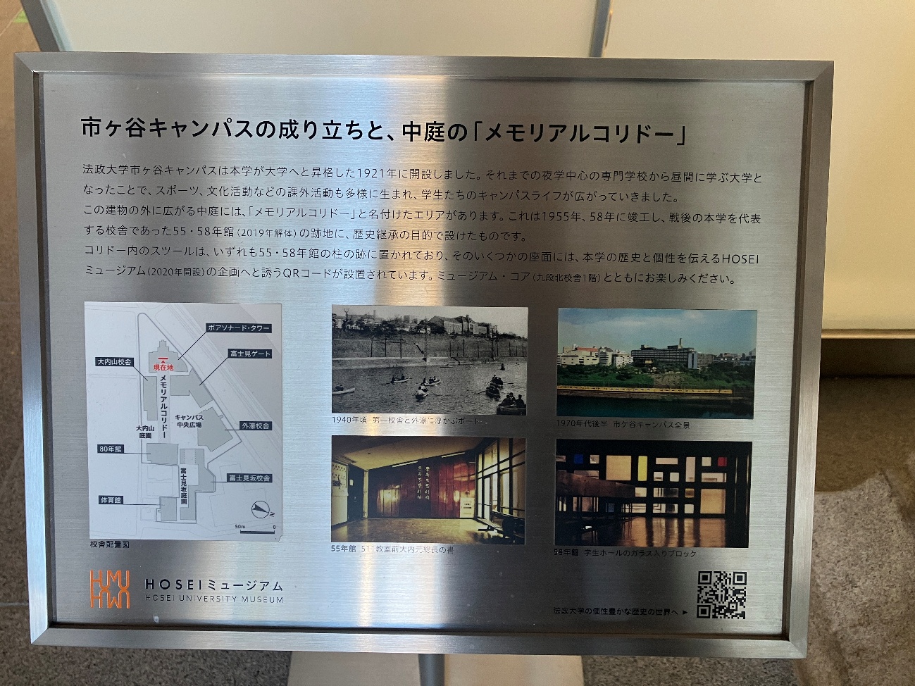 コリドー内のスツールは、いずれも 55・58年館の柱の跡に置かれており、そのいくつかの座面には、本学の歴史と個性を伝えるHOSEIミュージアム (2020年開設)の企画へと誘うQRコードが設置されています。