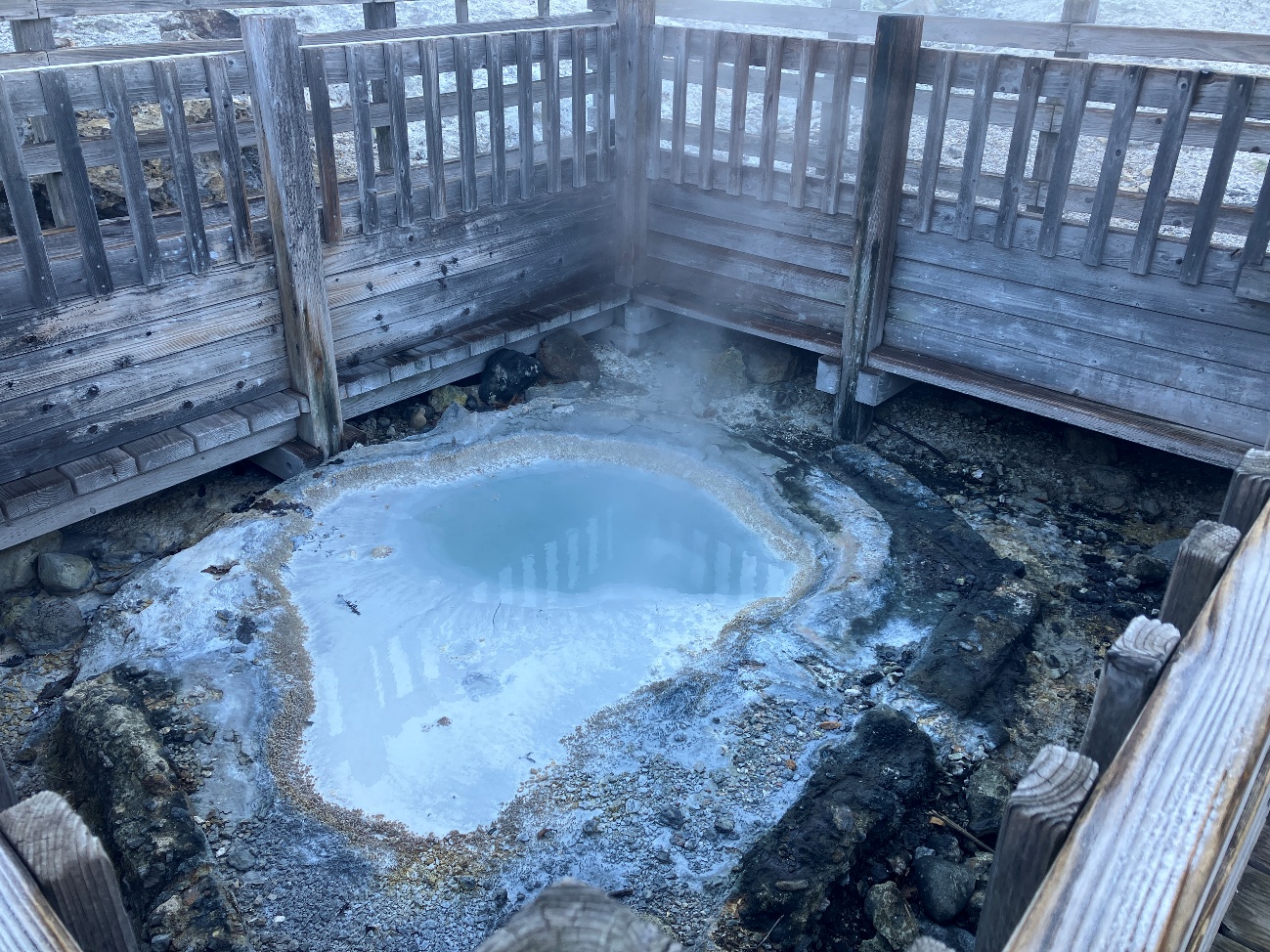 地獄谷のほぼ中心部に位置するこの池は、間欠泉(かんけつせん)として知られています。現在はかつてのような激しい噴出は見られませんが、煮えたぎるようにふつふつと熱湯が湧き出す様子は、まさに「地獄の釜」を連想させる迫力があります。